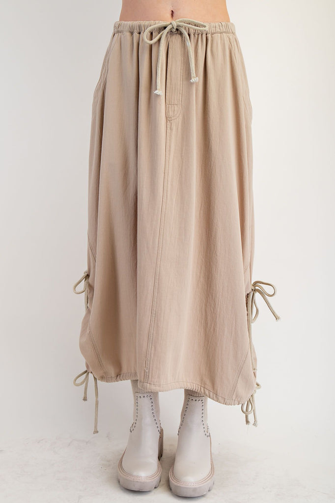 Size recommendations: true to size or size down. It runs generous. It has an elastic waistband and a functional drawstring.