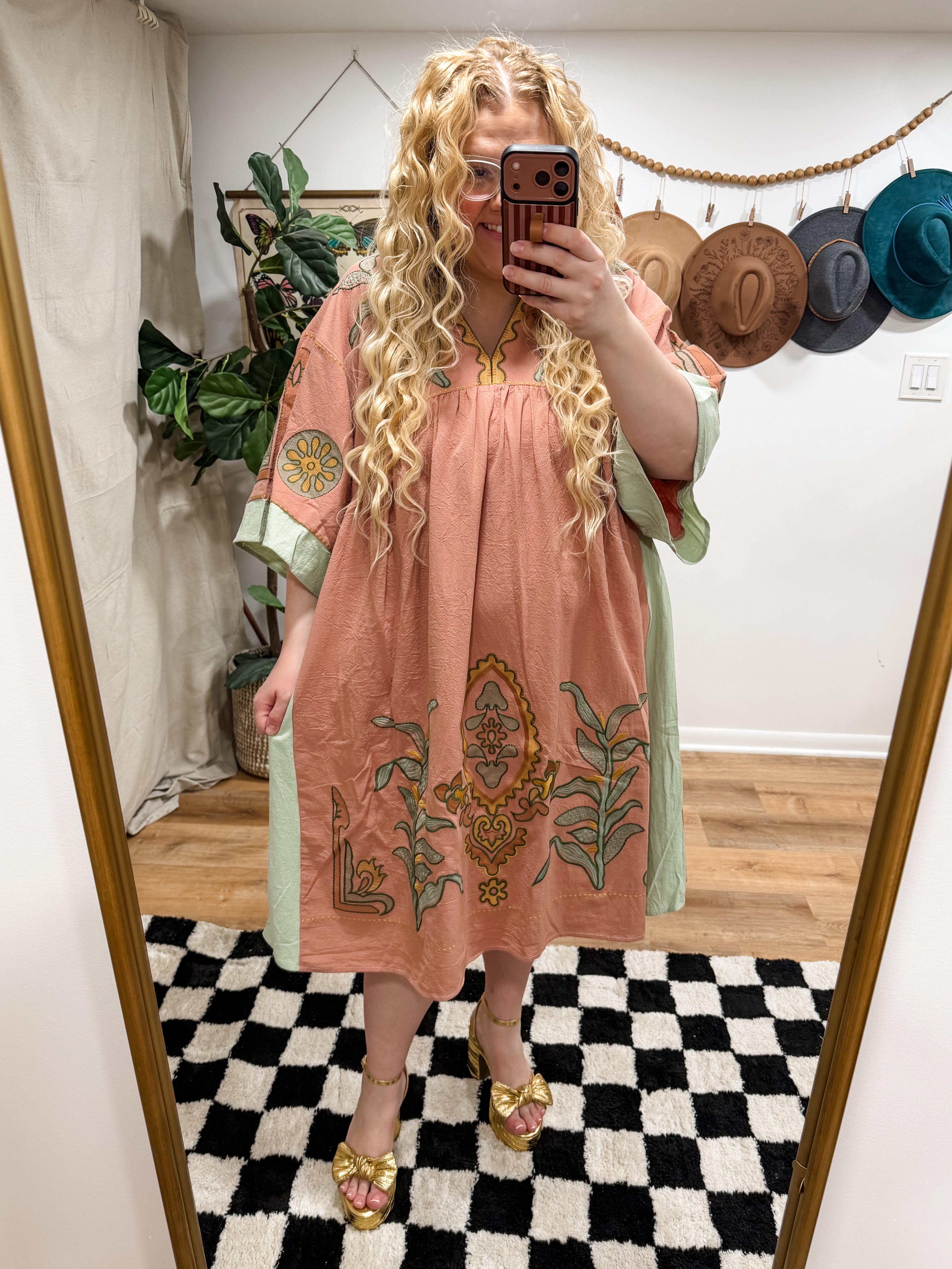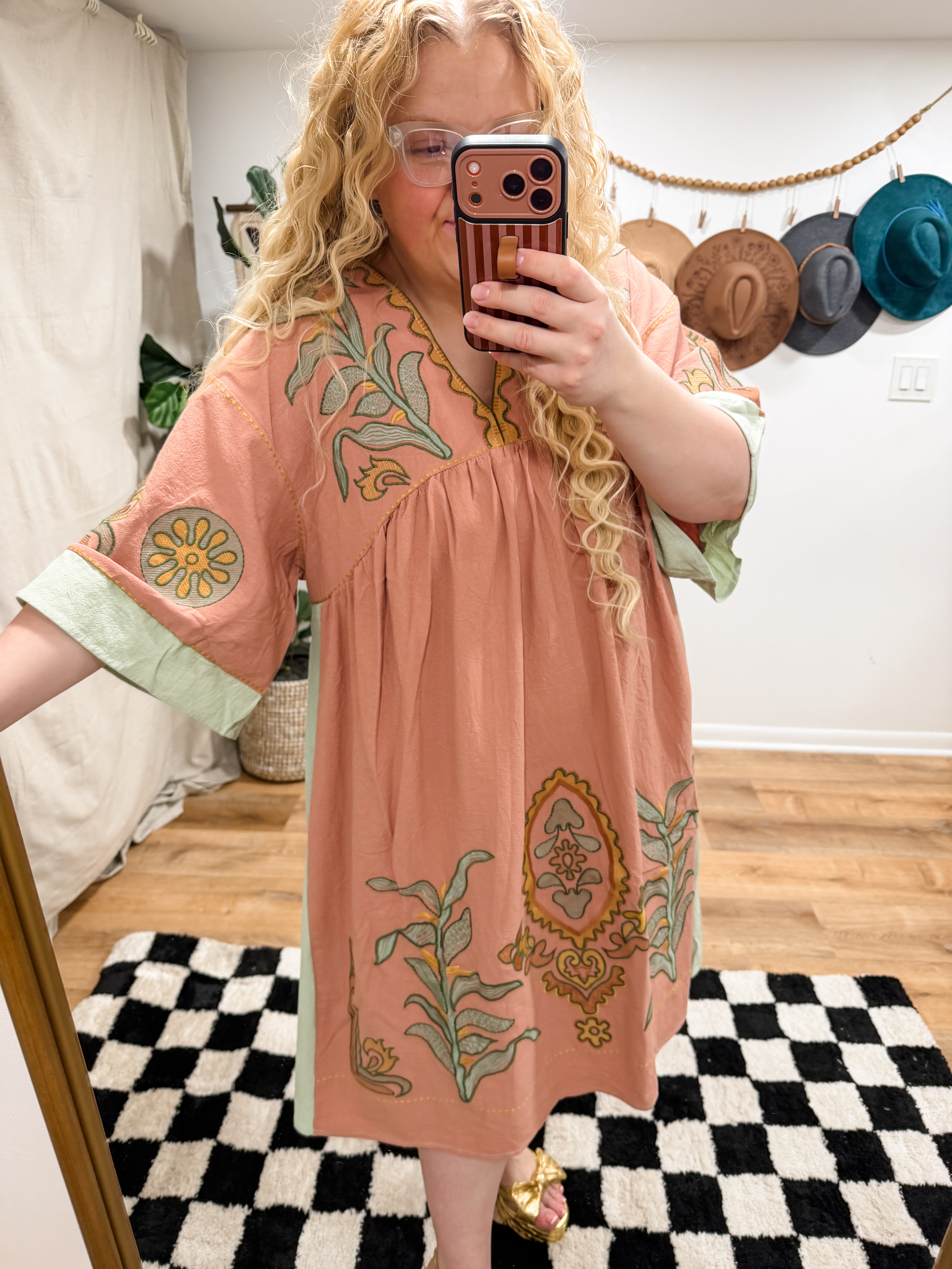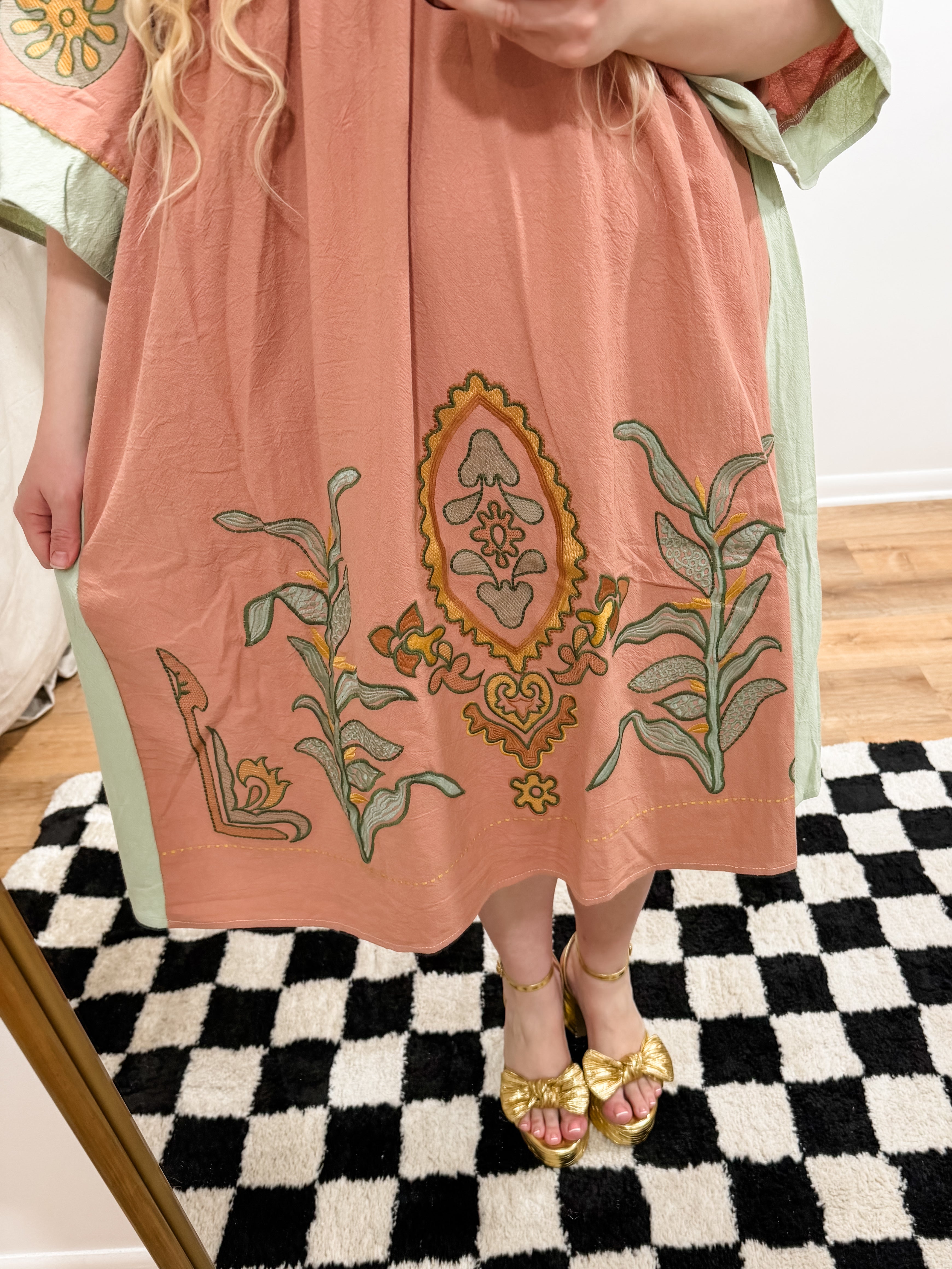 Size recommendations: True to size or size down. This dress is embroidered. It is an oversized dress. It has pockets.