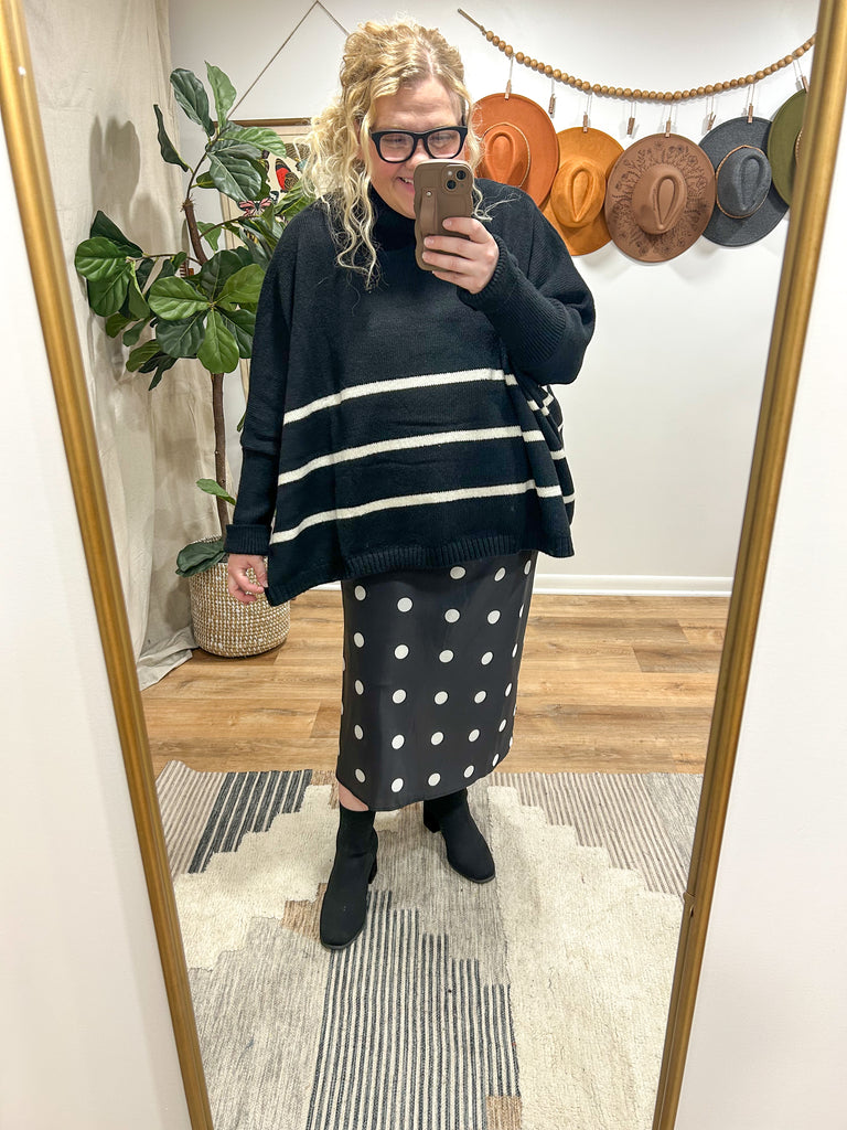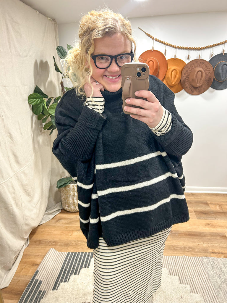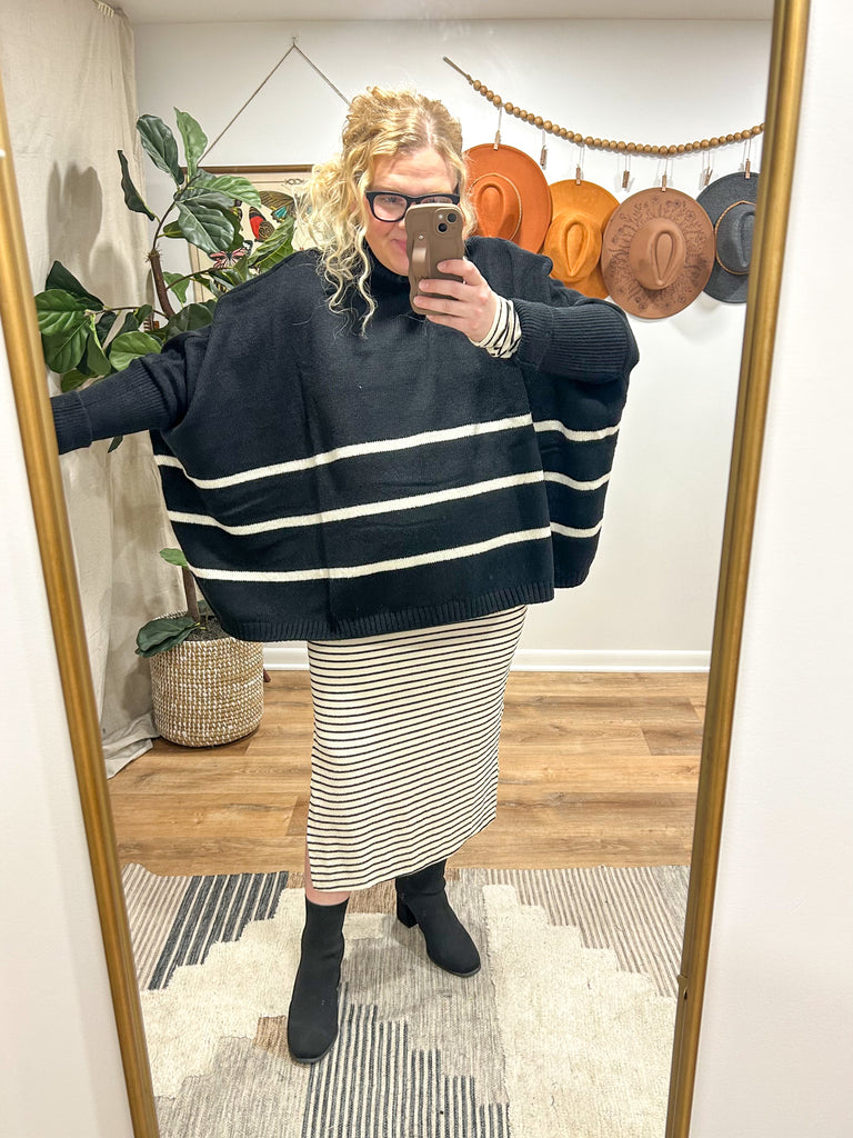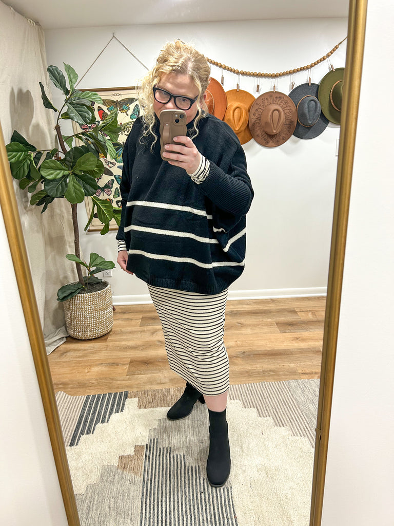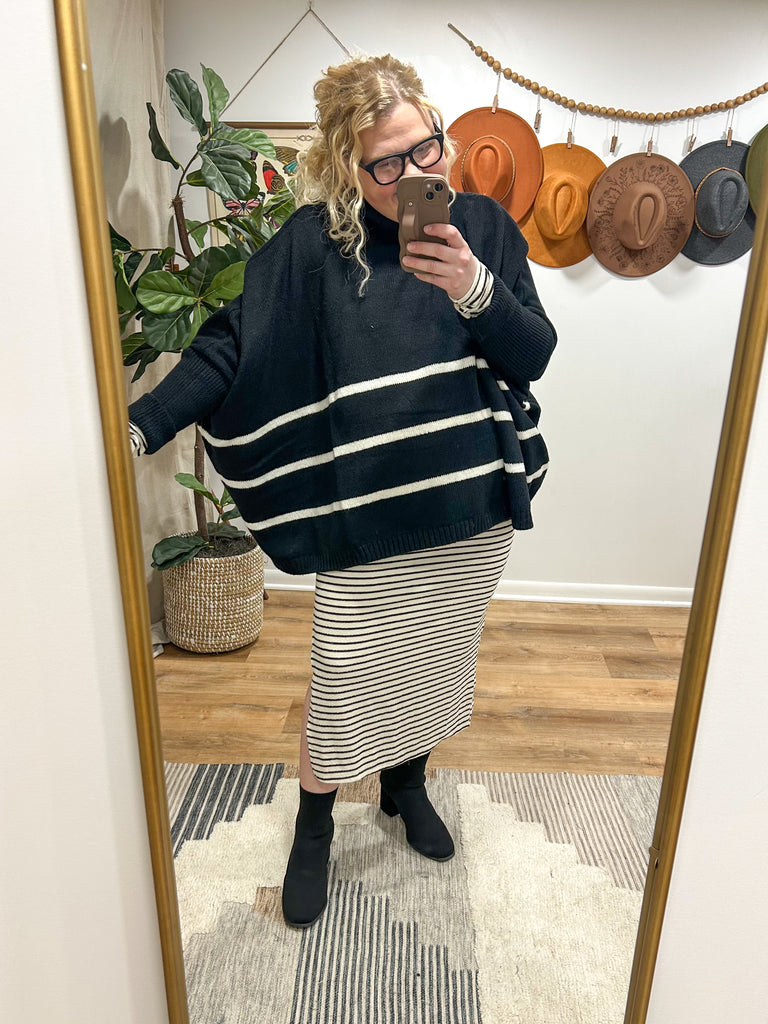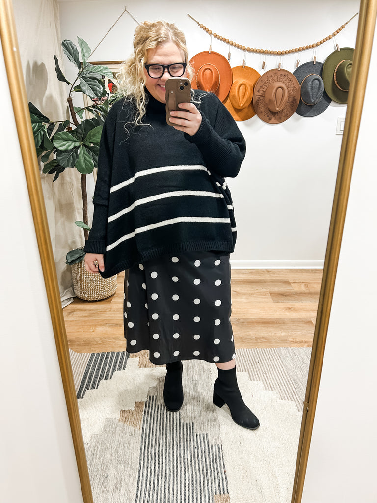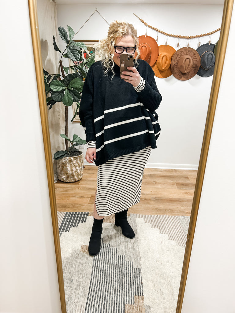 Size recommendations: Size down or go tts for an oversized look. This will fit plus size. This is an oversized, chunky knit sweater.