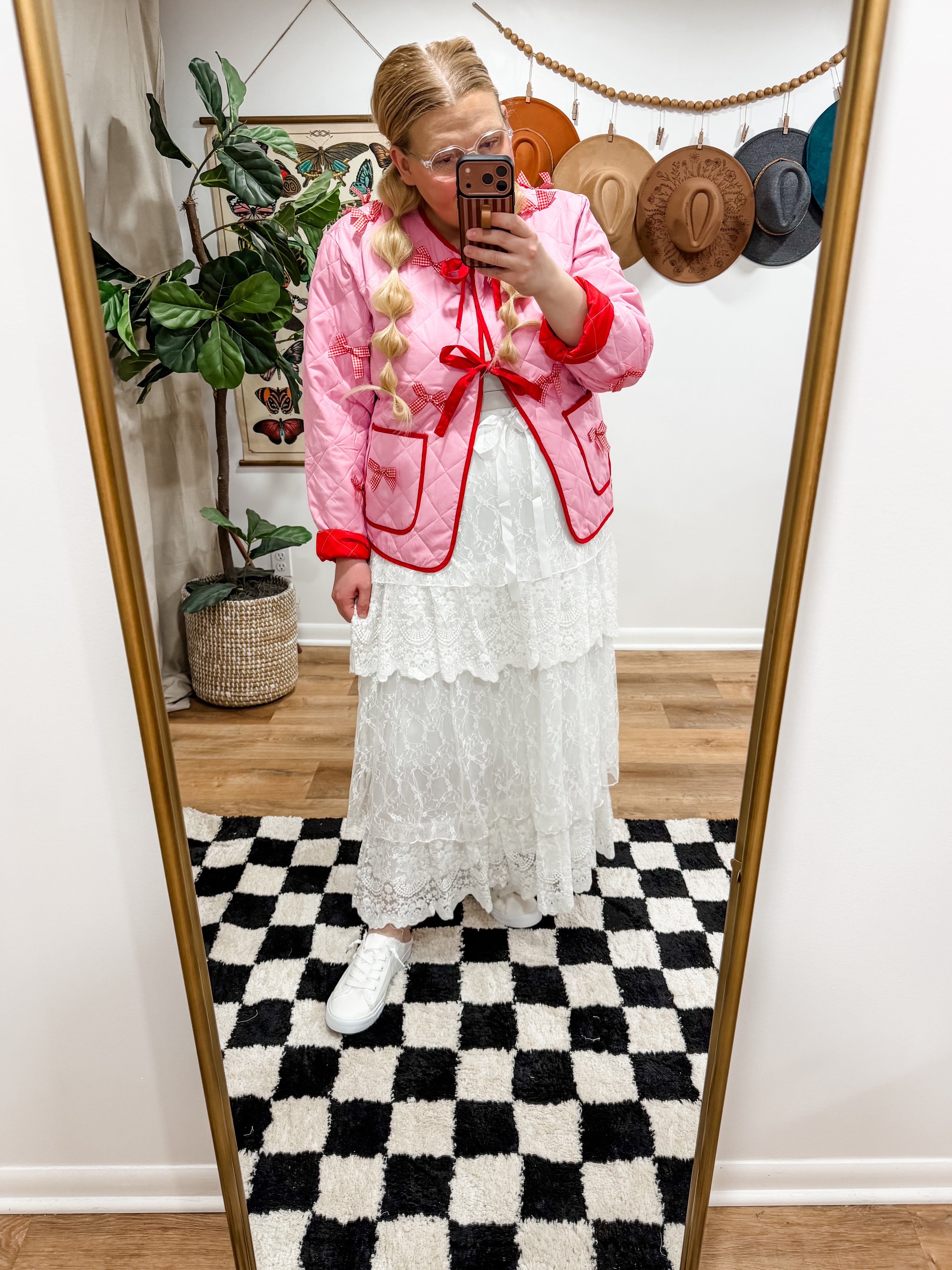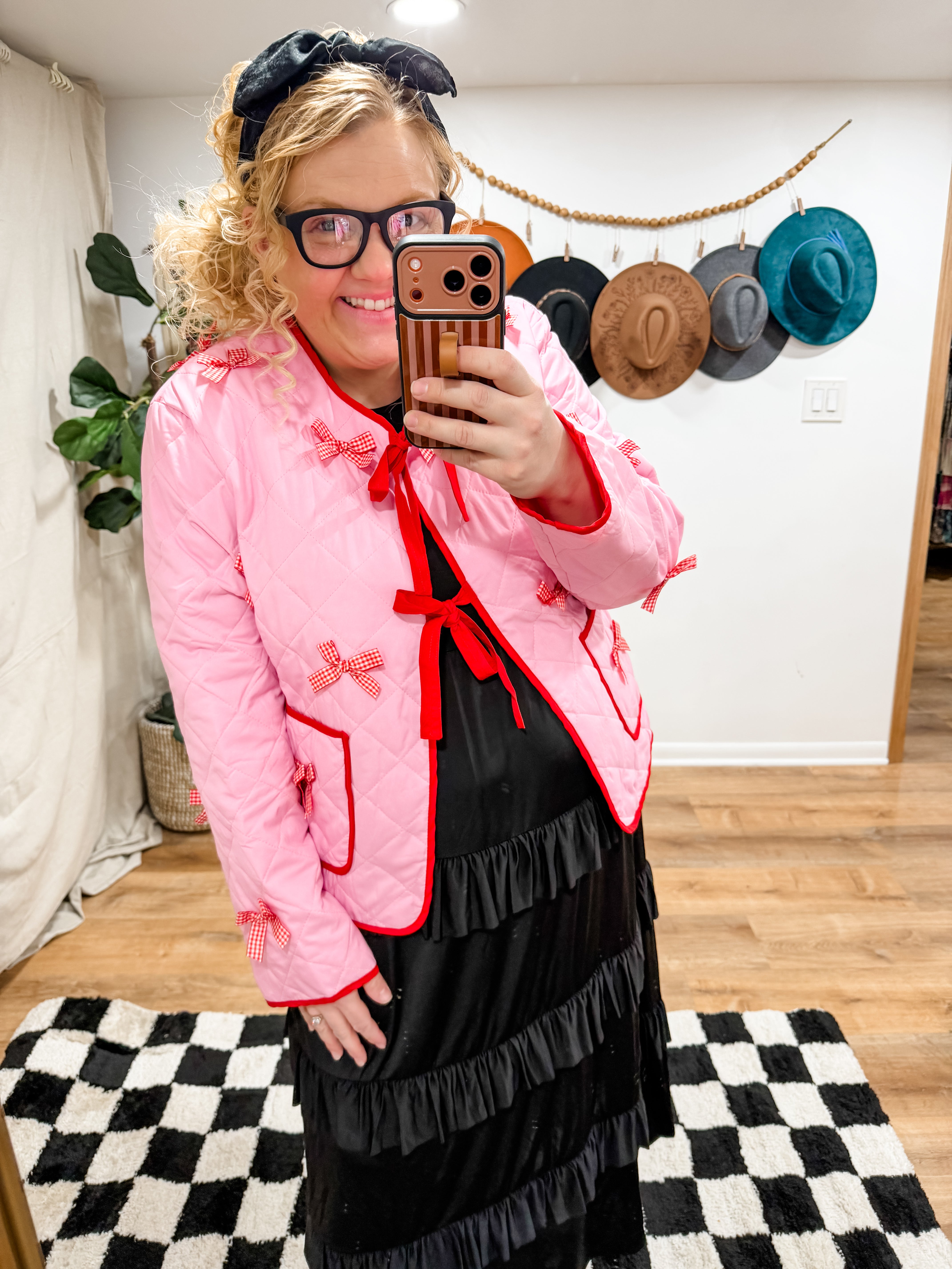 Size recommendations: true to size. This jacket has adjustable bow tie closures at the front. It is a quilted material. It has functional pockets at the front.