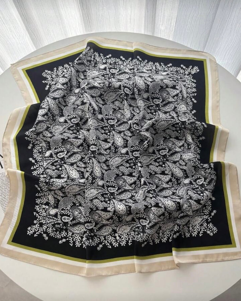 This scarf can be used in the hair, on the neck, or added to a handbag. There are several fun uses for a scarf. They add so much to an outfit. This scarf is approximately 28” x 28”.