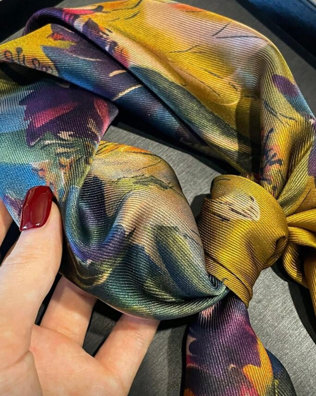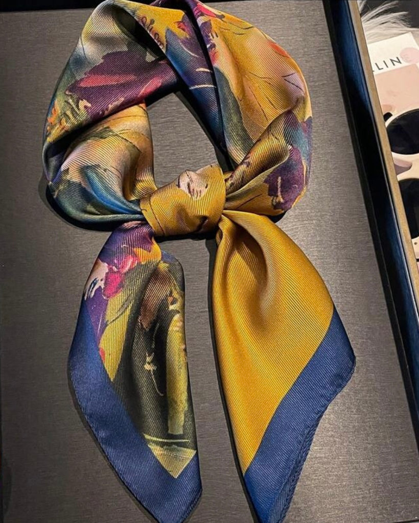 This scarf can be used in the hair, on the neck, or added to a handbag. There are several fun uses for a scarf. They add so much to an outfit. This scarf is approximately 27” x 27”.