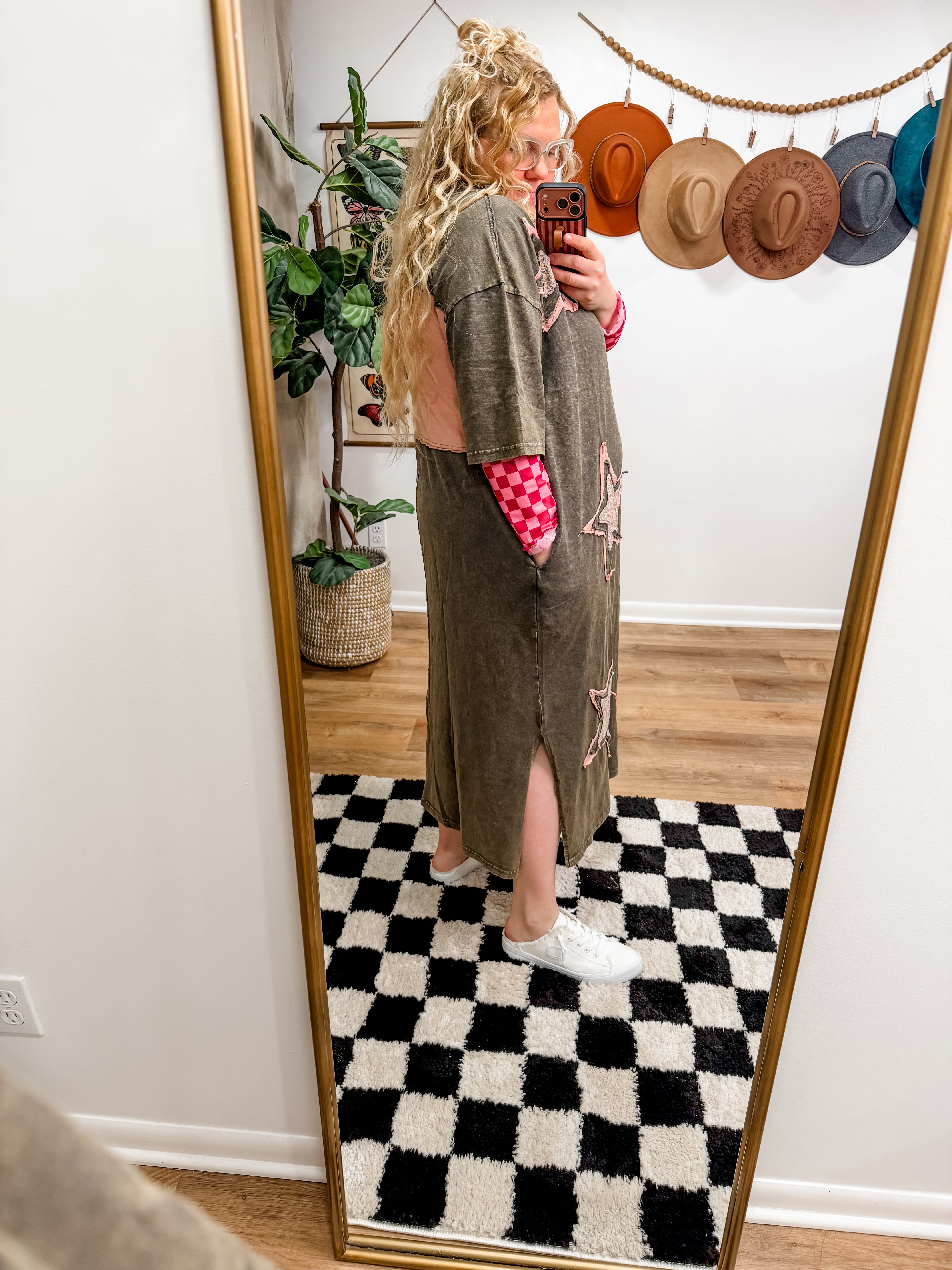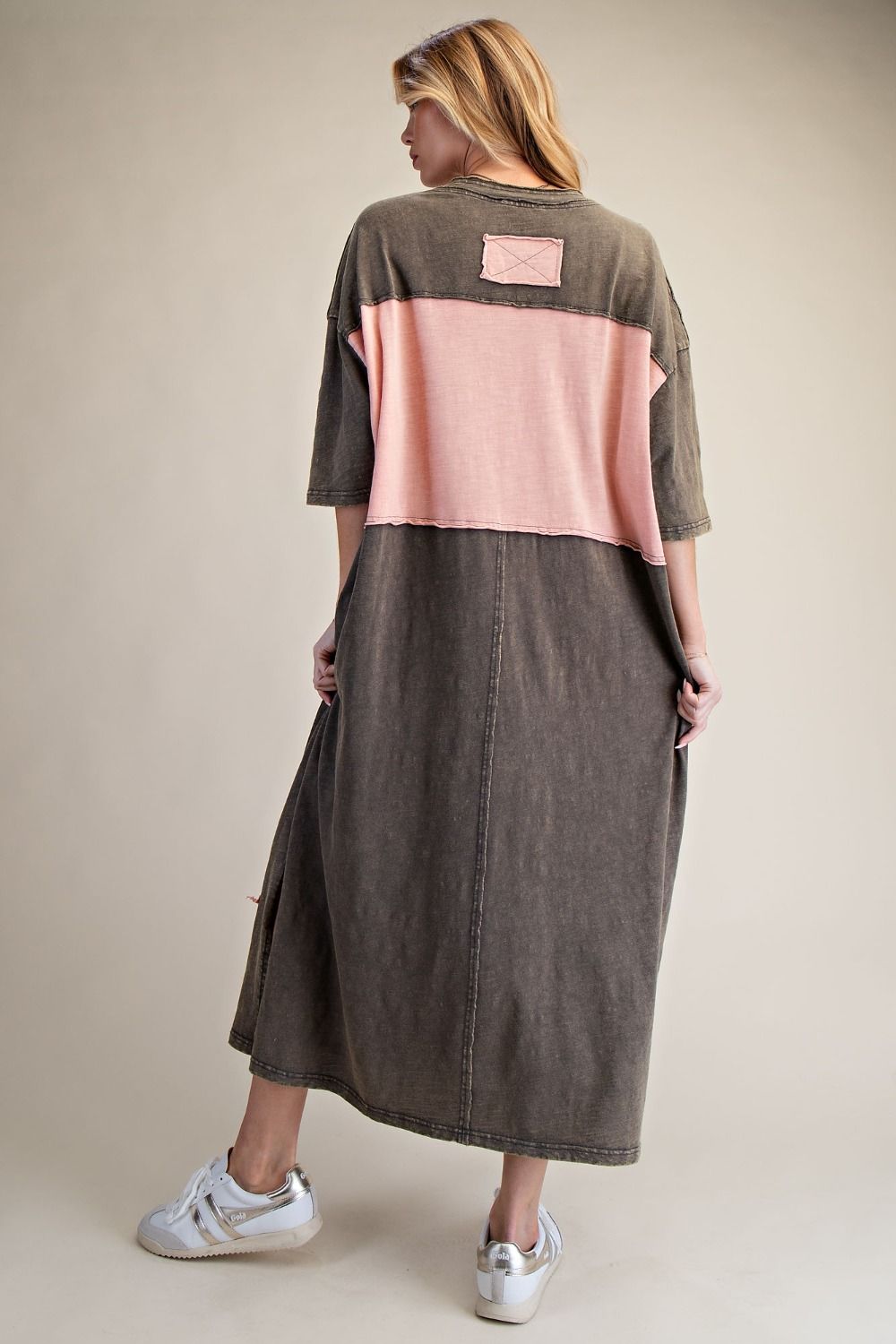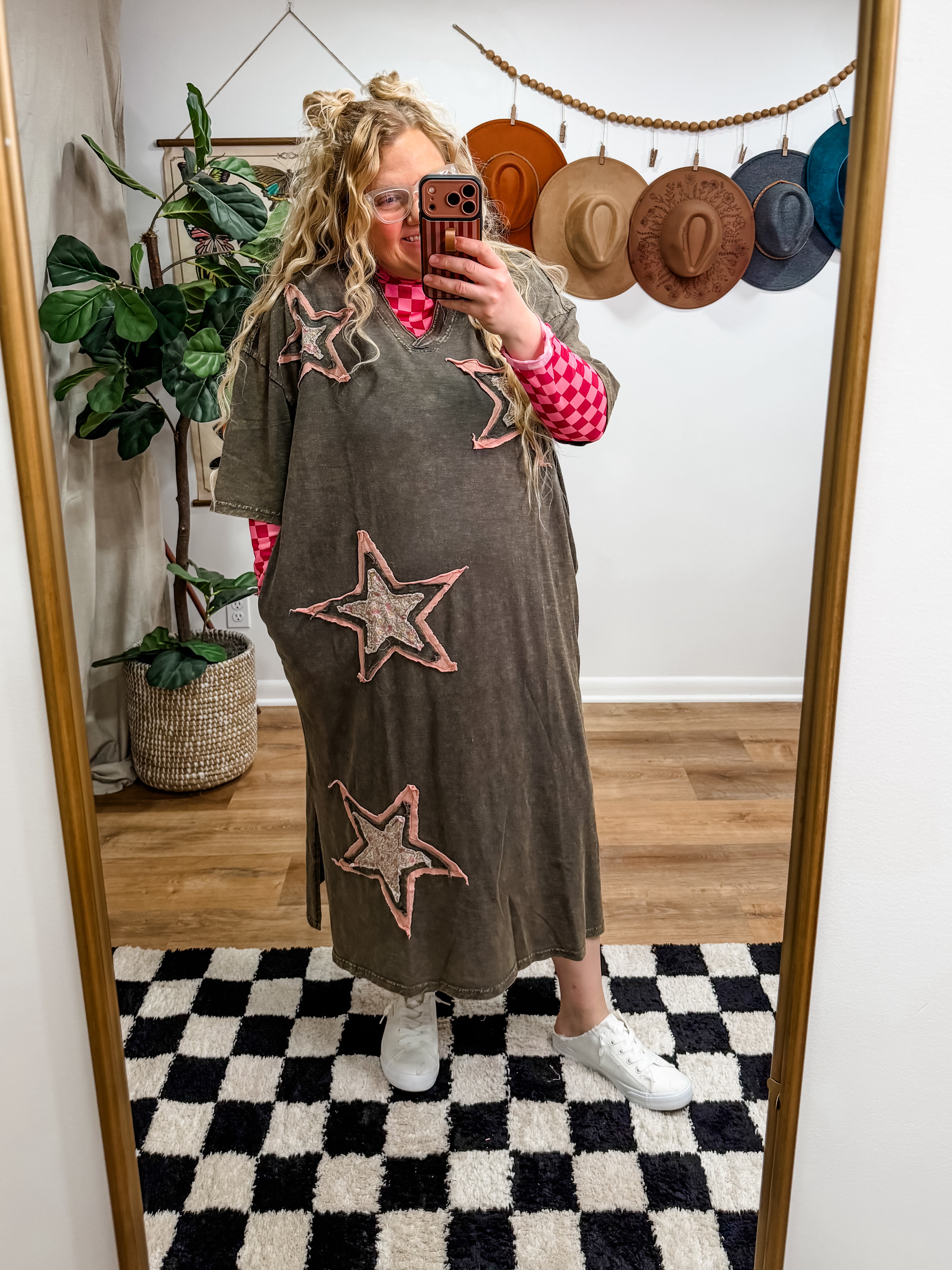 Size recommendations: Size down. It is an oversized t-shirt dress. You can go true to size for an extra oversized fit. It’s a super stretchy, cotton material. It will fit some plus. It has pockets! Kayla is wearing the small.