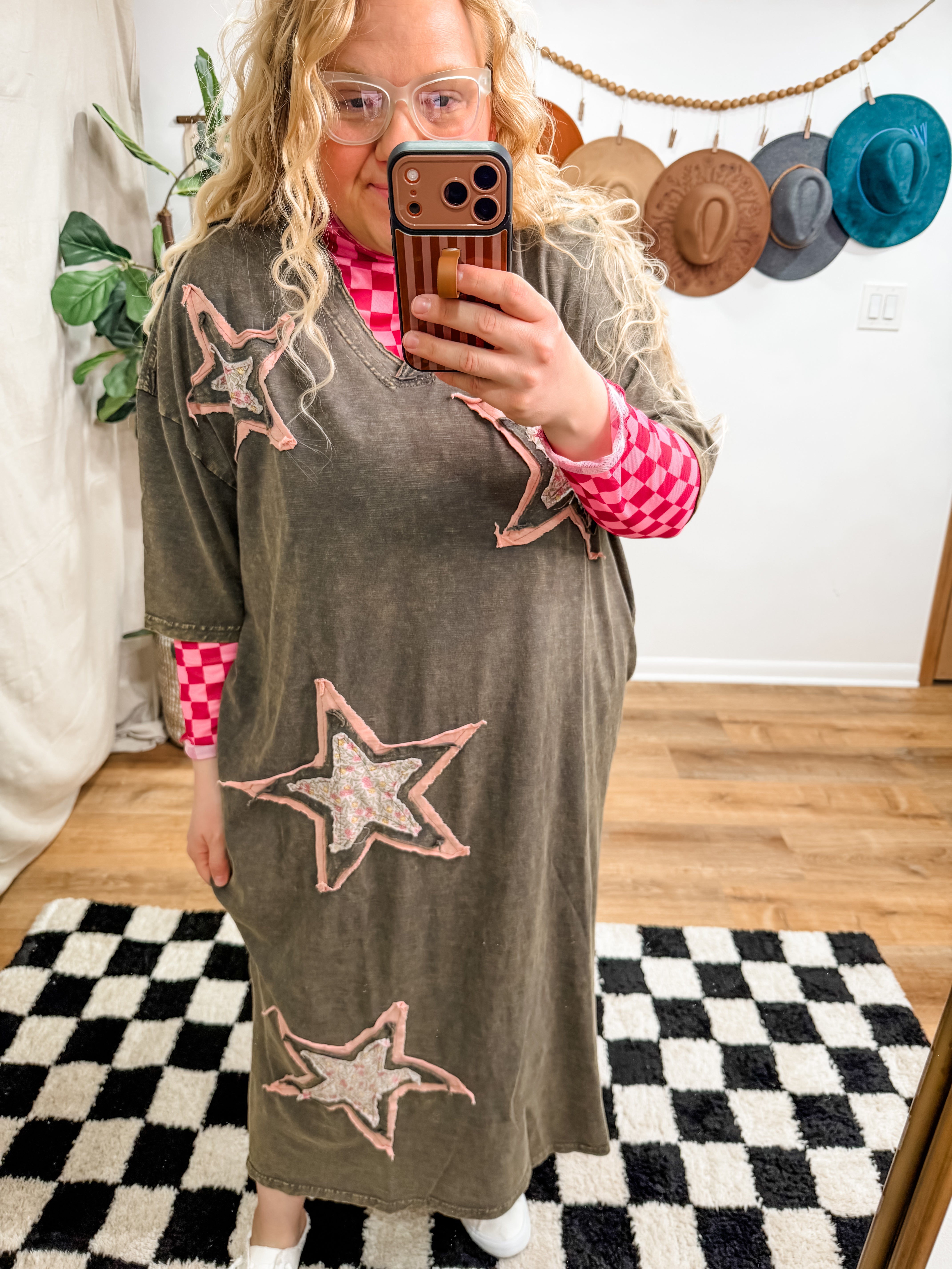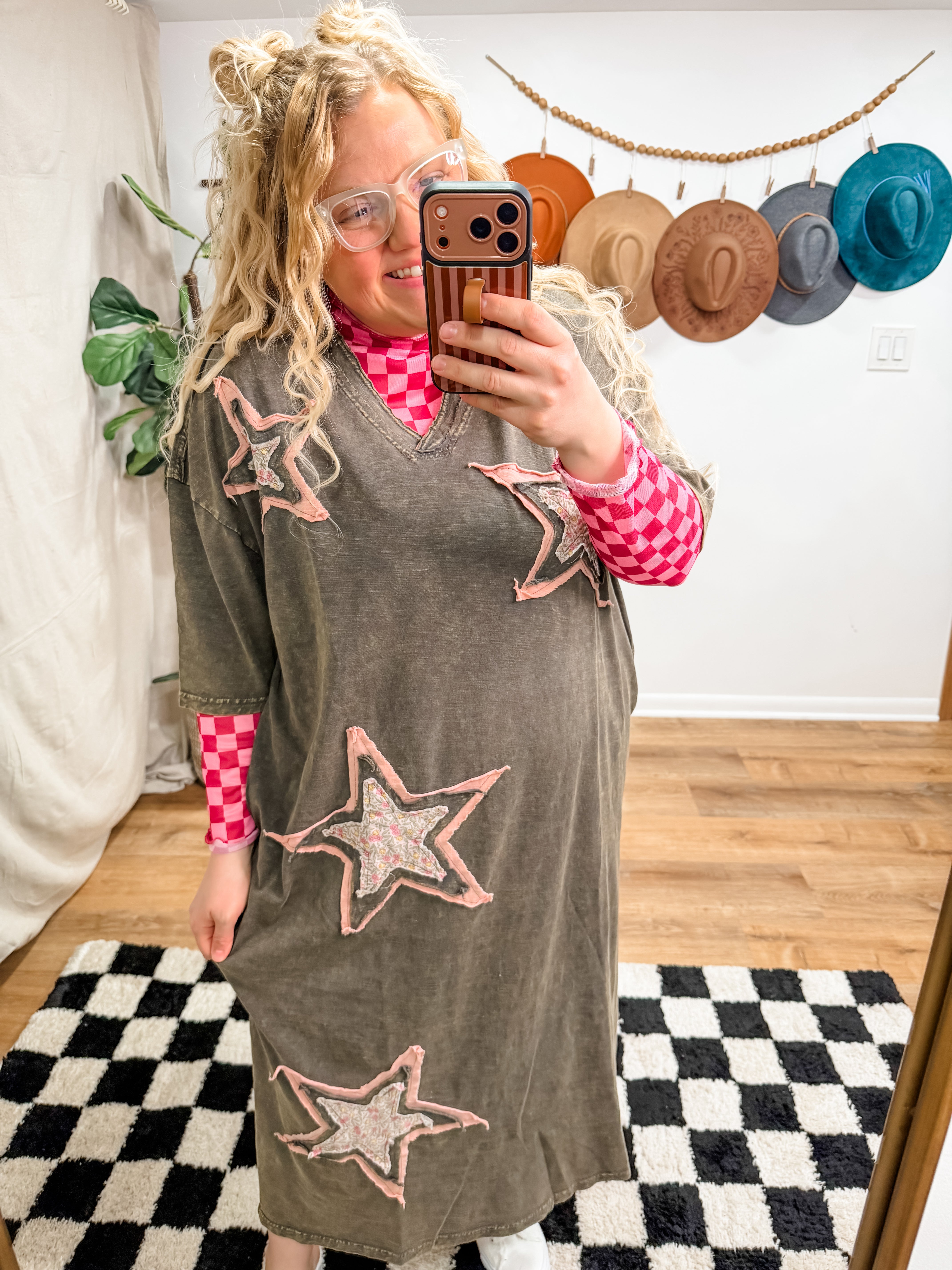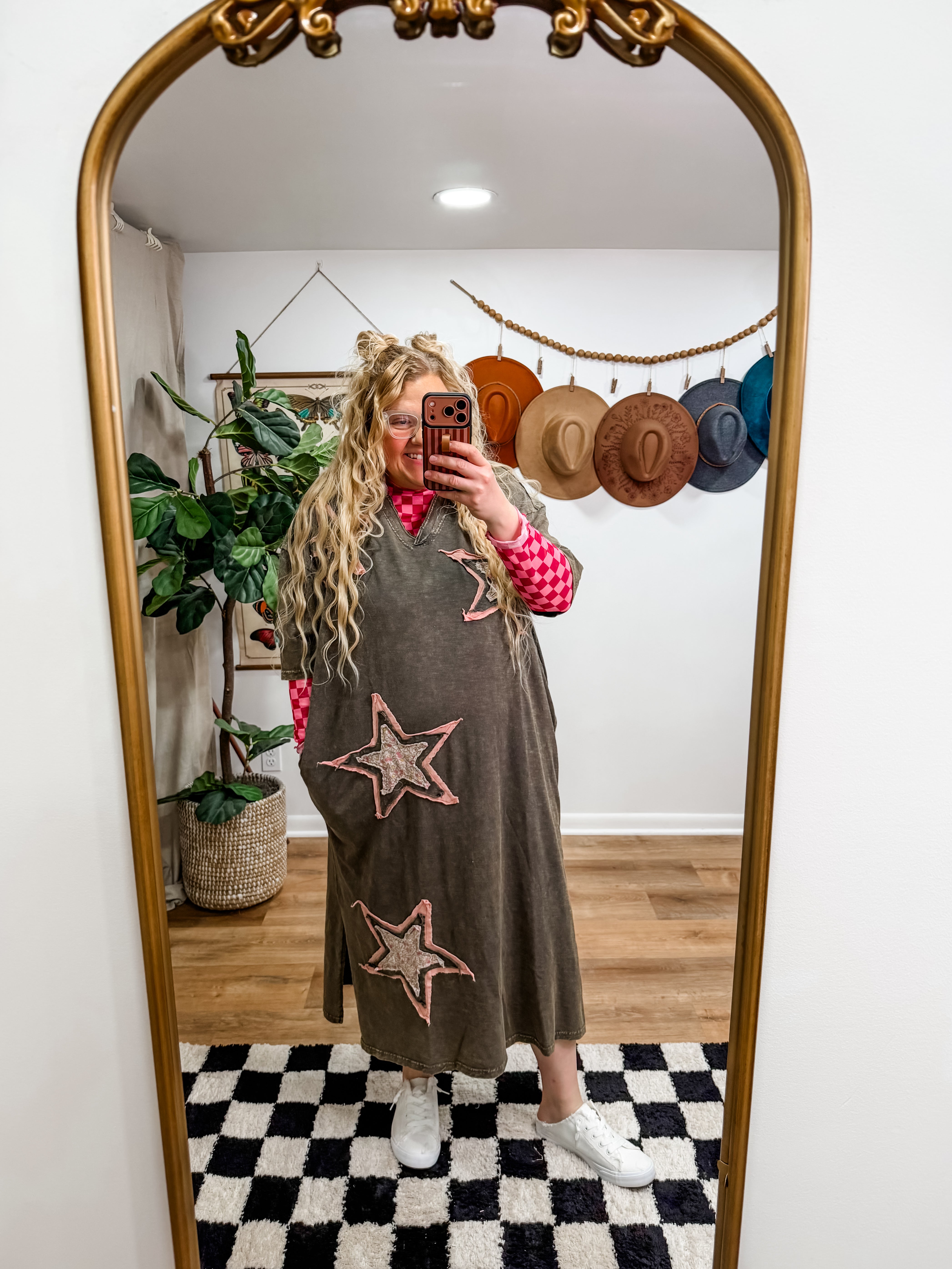 Size recommendations: Size down. It is an oversized t-shirt dress. You can go true to size for an extra oversized fit. It’s a super stretchy, cotton material. It will fit some plus. It has pockets! Kayla is wearing the small.