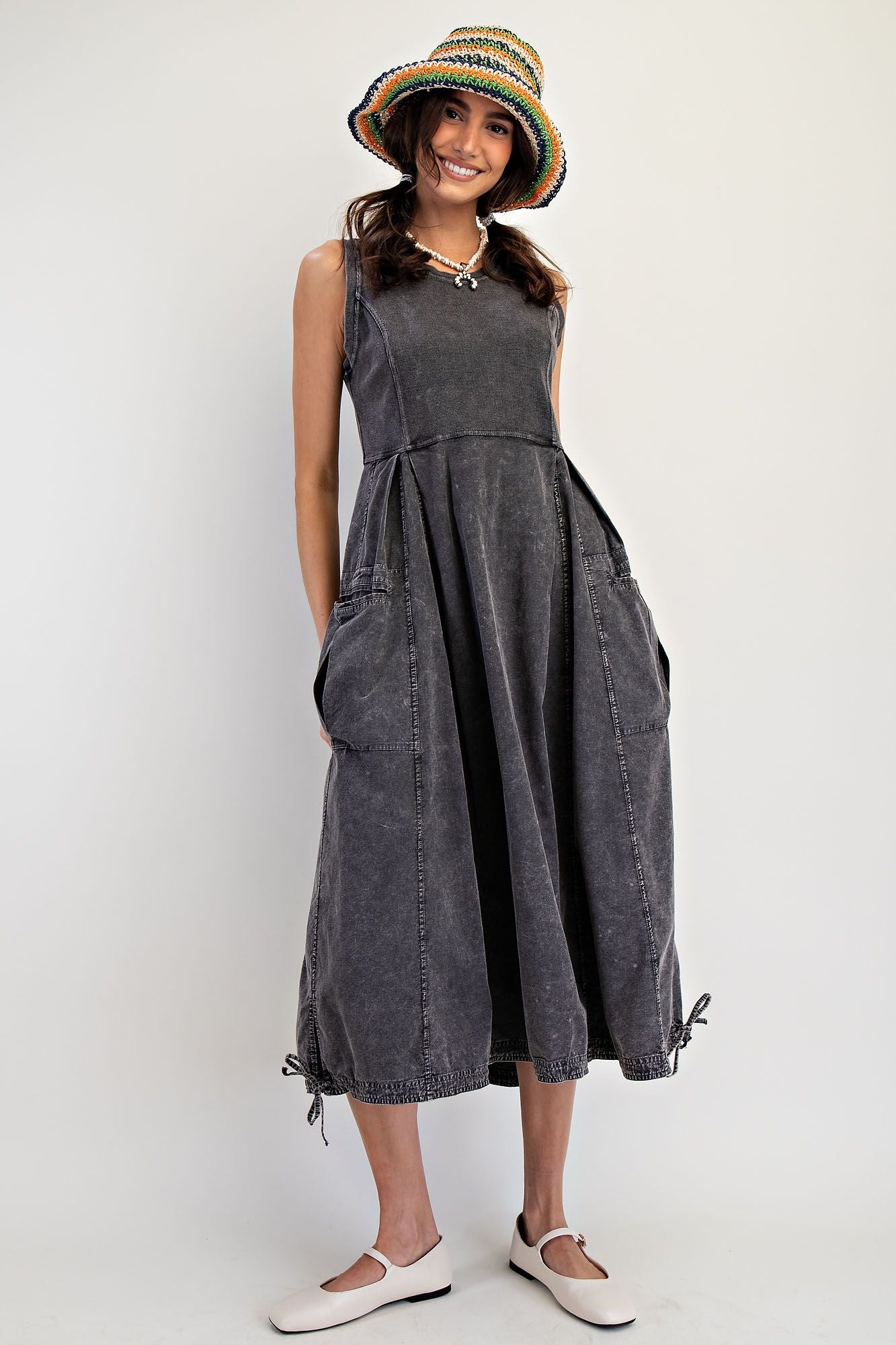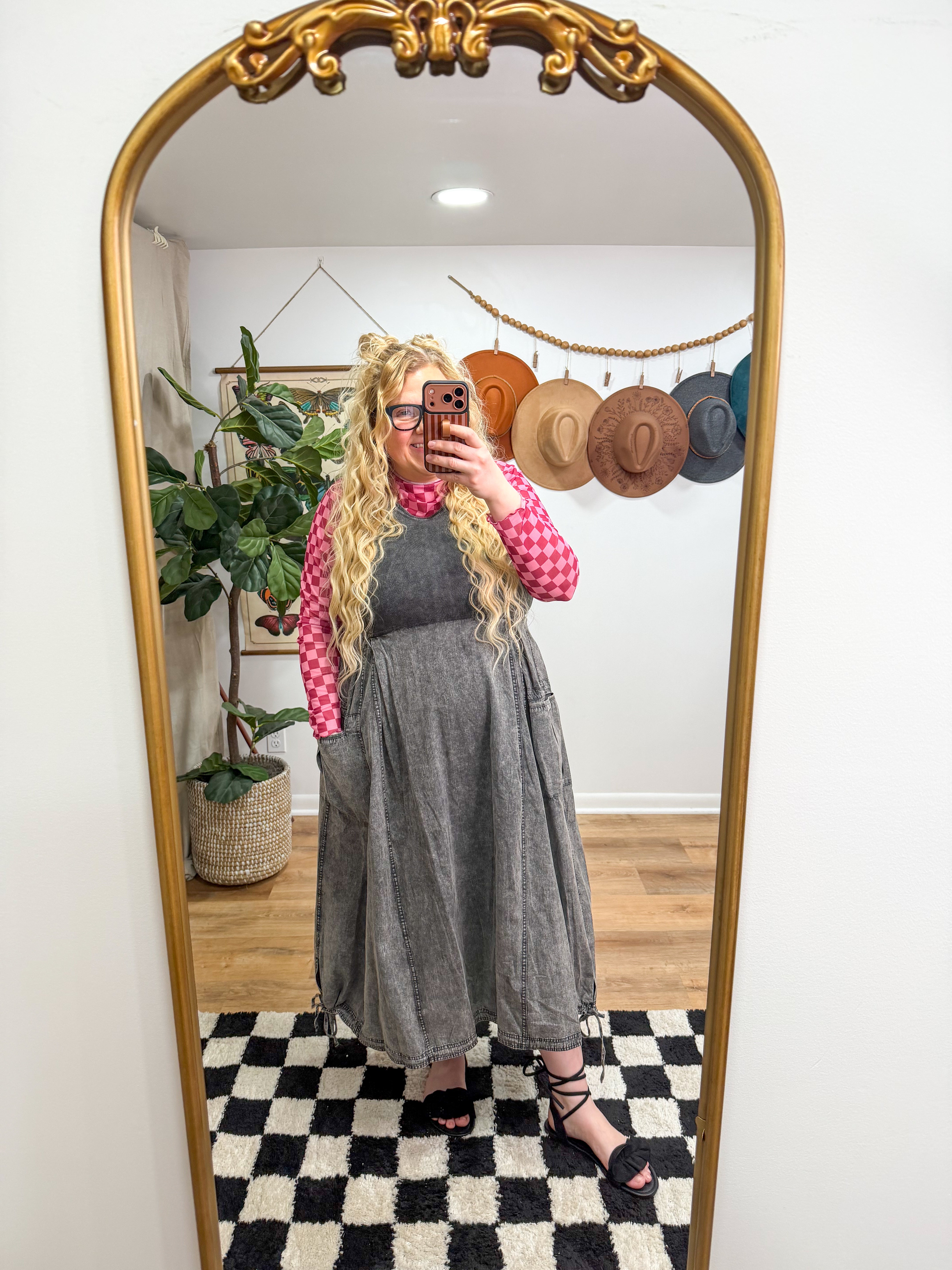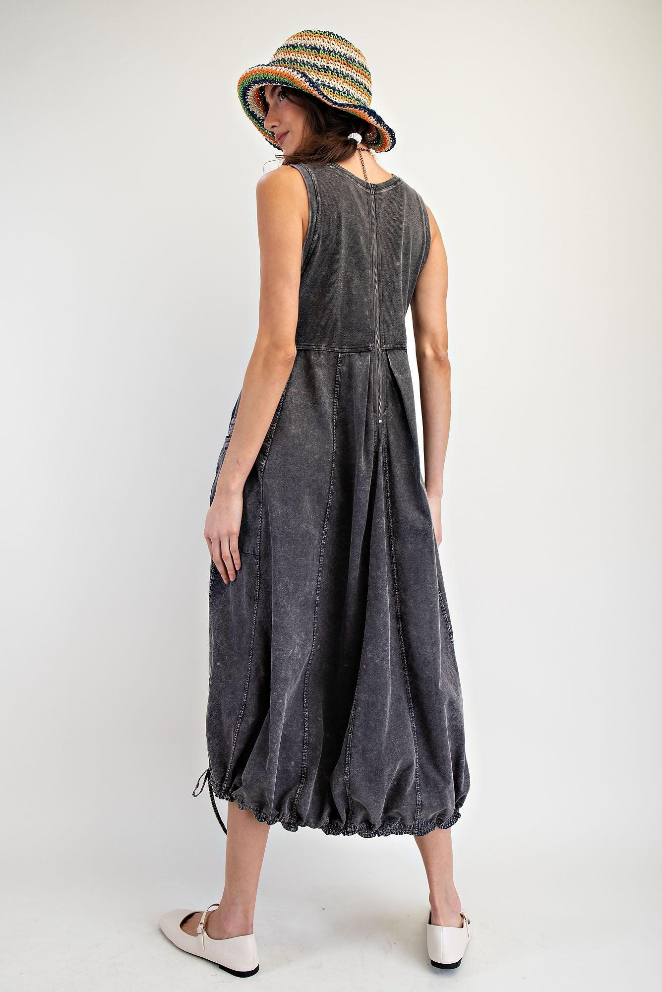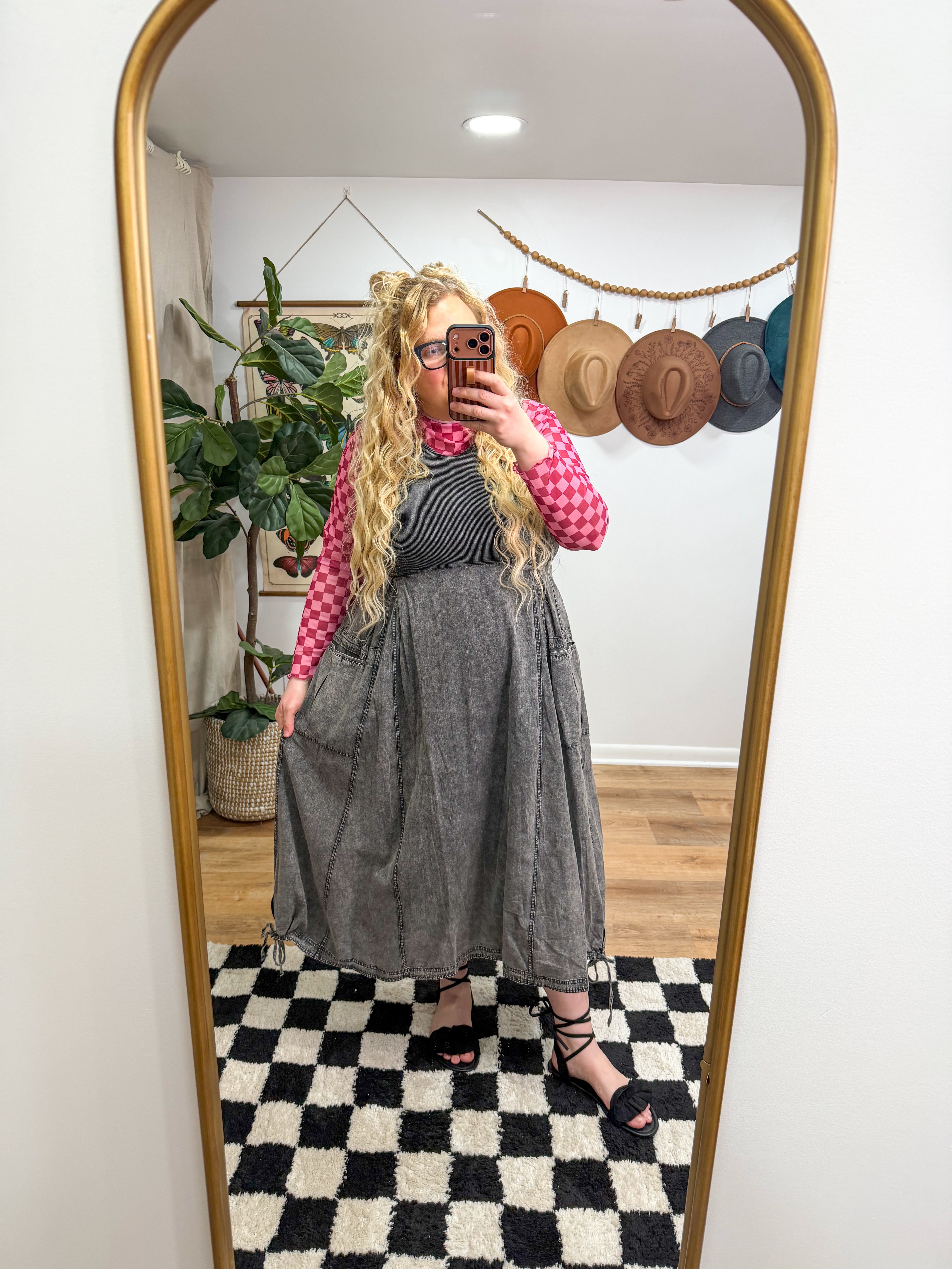 Size recommendations: True to size. This dress is a has a stretchy, ribbed material at the top. It has adjustable drawstrings at the bottom and a zipper up the back. It has pockets!