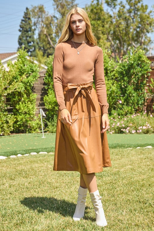 It is a stretchy, sweater material at the top and has a pleather skirt. It has a belt attached.