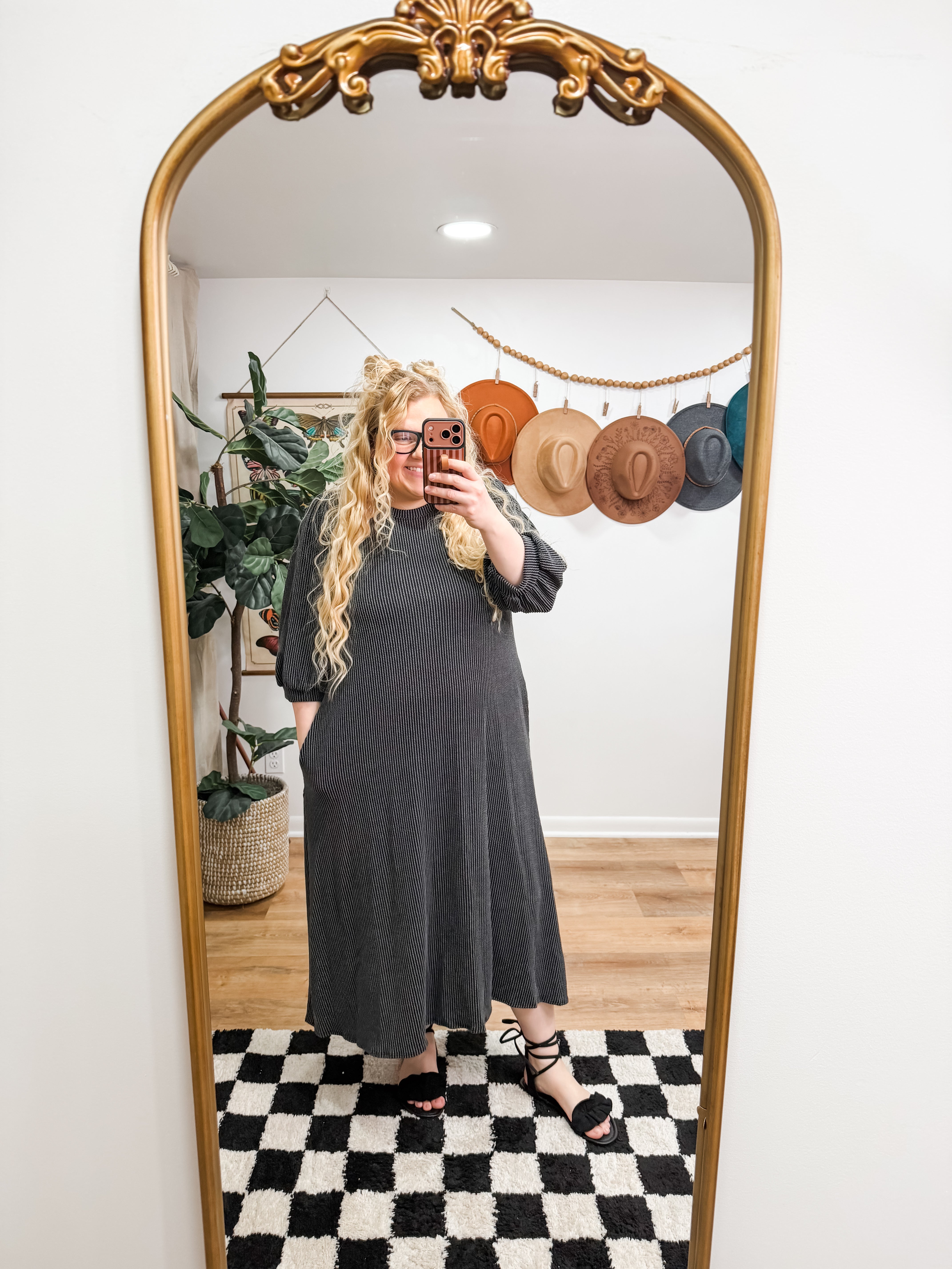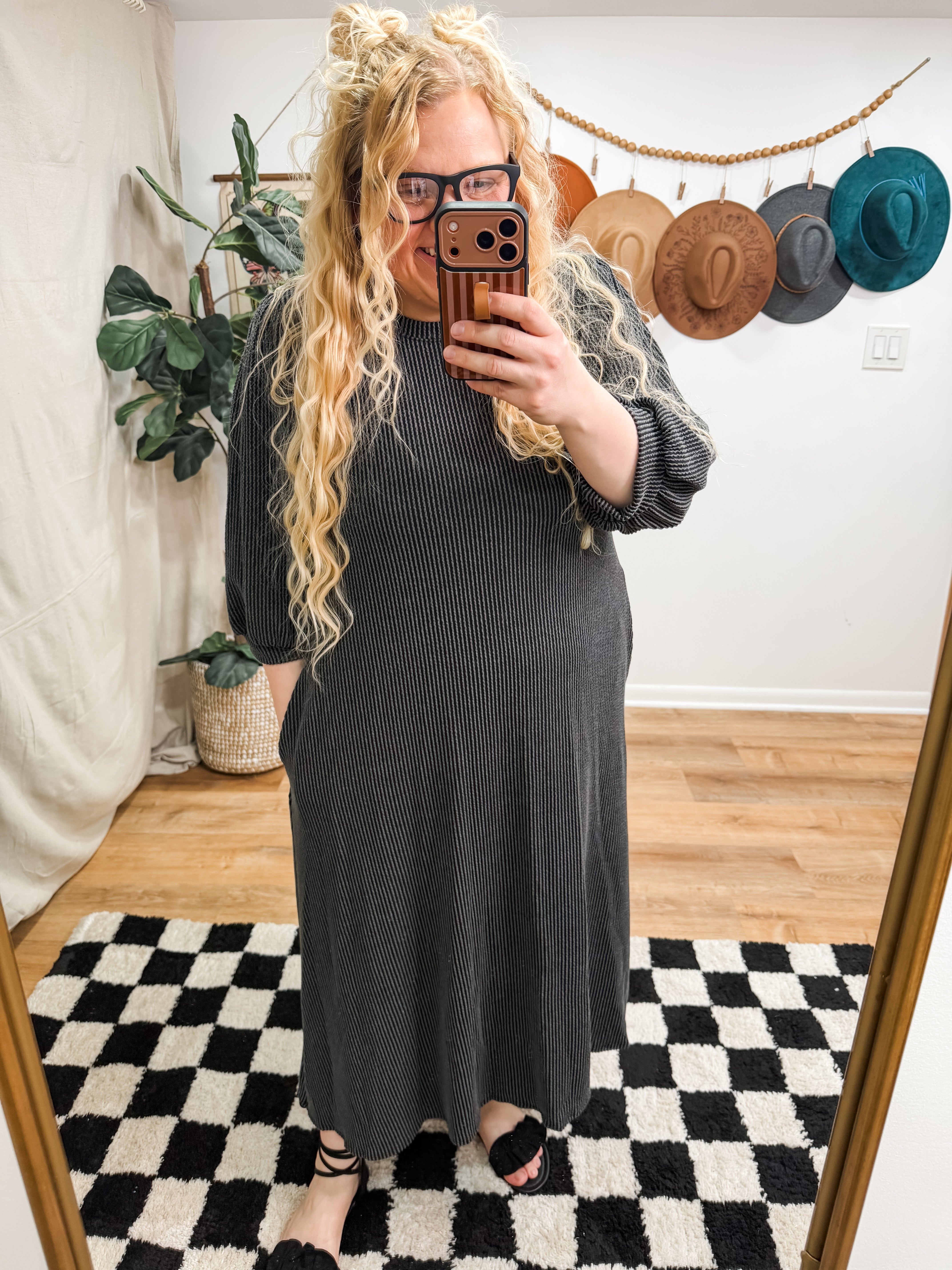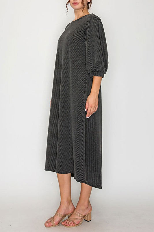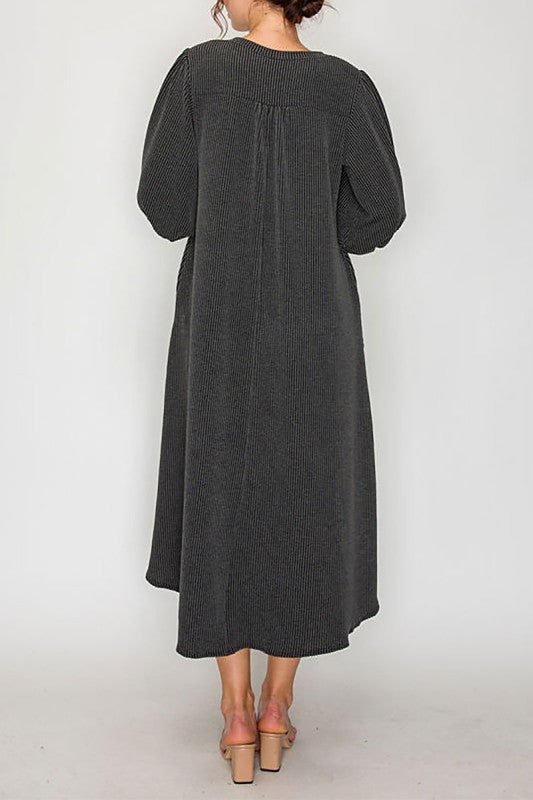 Size recommendations: True to size. This dress is a stretchy, ribbed material. It is longer in the back than in the front and it has pockets.