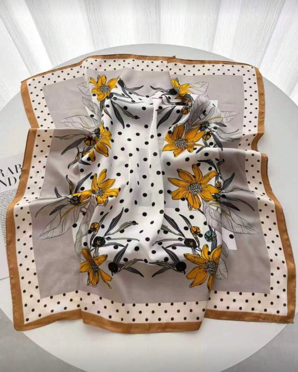 This scarf can be used in the hair, on the neck, or added to a handbag. There are several fun uses for a scarf. They add so much to an outfit. This scarf is approximately 26” x 26”.